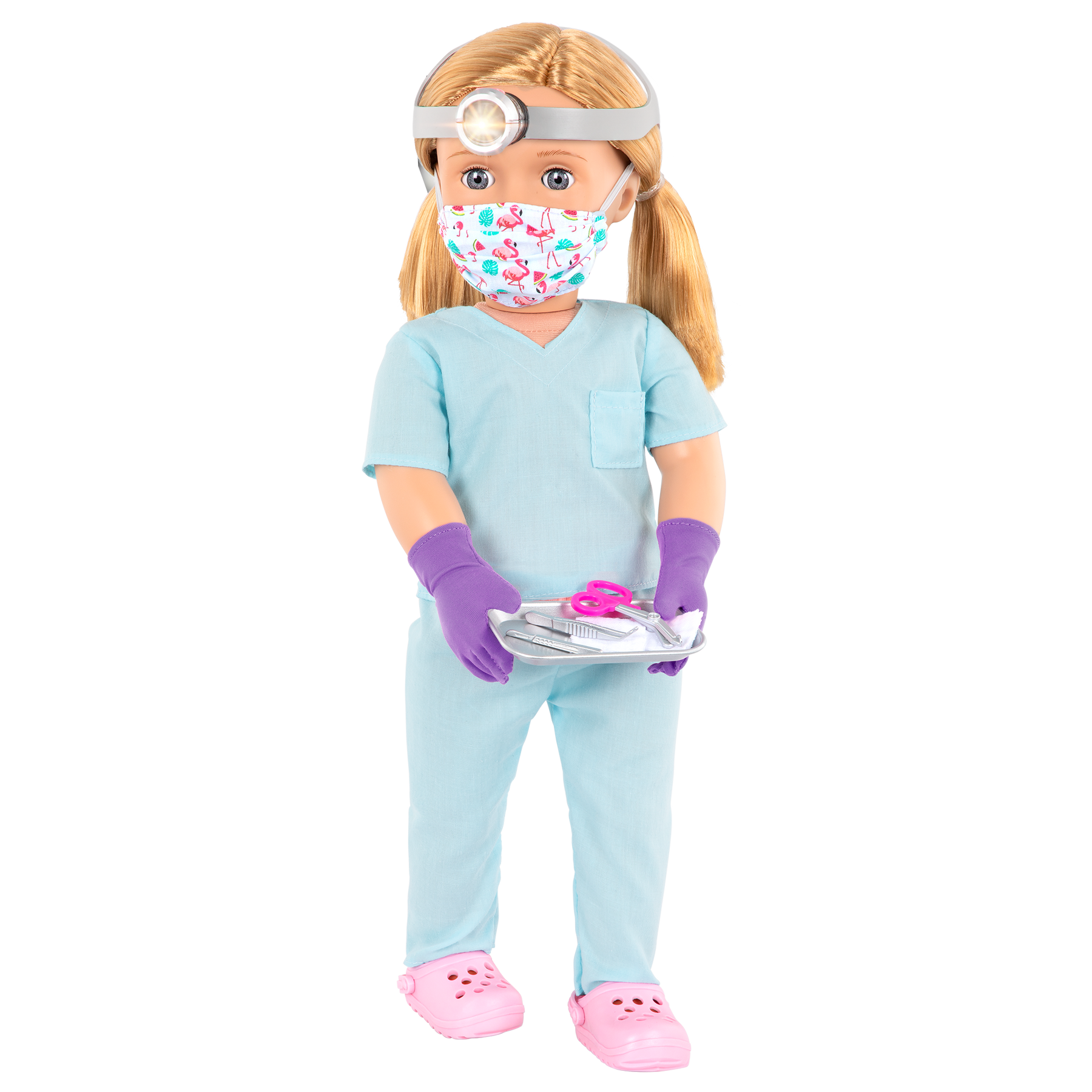 Perform fun checkups with the Our Generation 46 cm doctor doll Tonia! This sweet surgeon is always ready to help her friends get back to happy health. Tonia has bright blue eyes that open and close, and her long blonde hair is fun to brush and style. She can also rotate her arms and legs to give her patients the best care with the realistic accessories! Put on Tonia's face mask and the pair of purple gloves for added safety, then light up her headlamp with the push of a button! The stethoscope comfortably fits in Tonia's ears to listen to her patient's heartbeats, and you can fill out the medical form once the checkup is all done! Tonia's scrubs outfit features easy-open closures that make it quick to put on and remove, so you can easily change her into many colourful outfits to join her friends on more fun adventures! (Additional outfits sold separately)