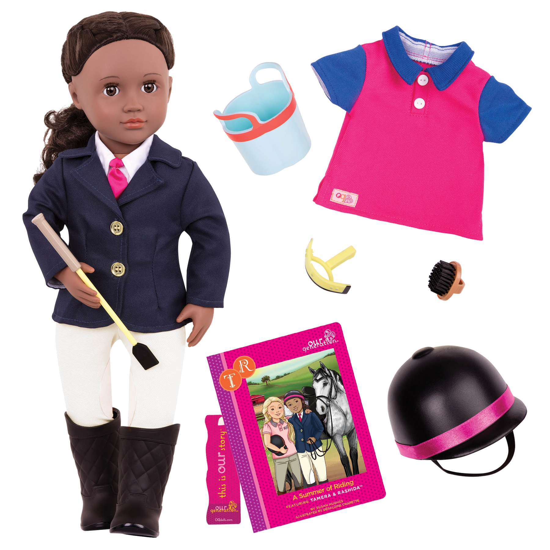 From dressage to dismount, riding is a way of life for Our Generation Deluxe 18-inch Doll – Rashida, a beautiful posable doll with brown eyes and long, dark-brown, curly hair. Prepare for the competition in a bright pink polo shirt, riding pants, and boots. When it’s time to impress the judges, wear the formal riding jacket with beautiful gold buttons and a button-up short-sleeved shirt with collar. Care for her horse with the riding crop, brush, scraper and bucket. Read about her adventures in the storybook “A Summer of Riding” and create your own stories with this inspiring collection. This deluxe set comes with 2 outfits, fun riding accessories, and a Rashida chapter book. (Horses sold separately)