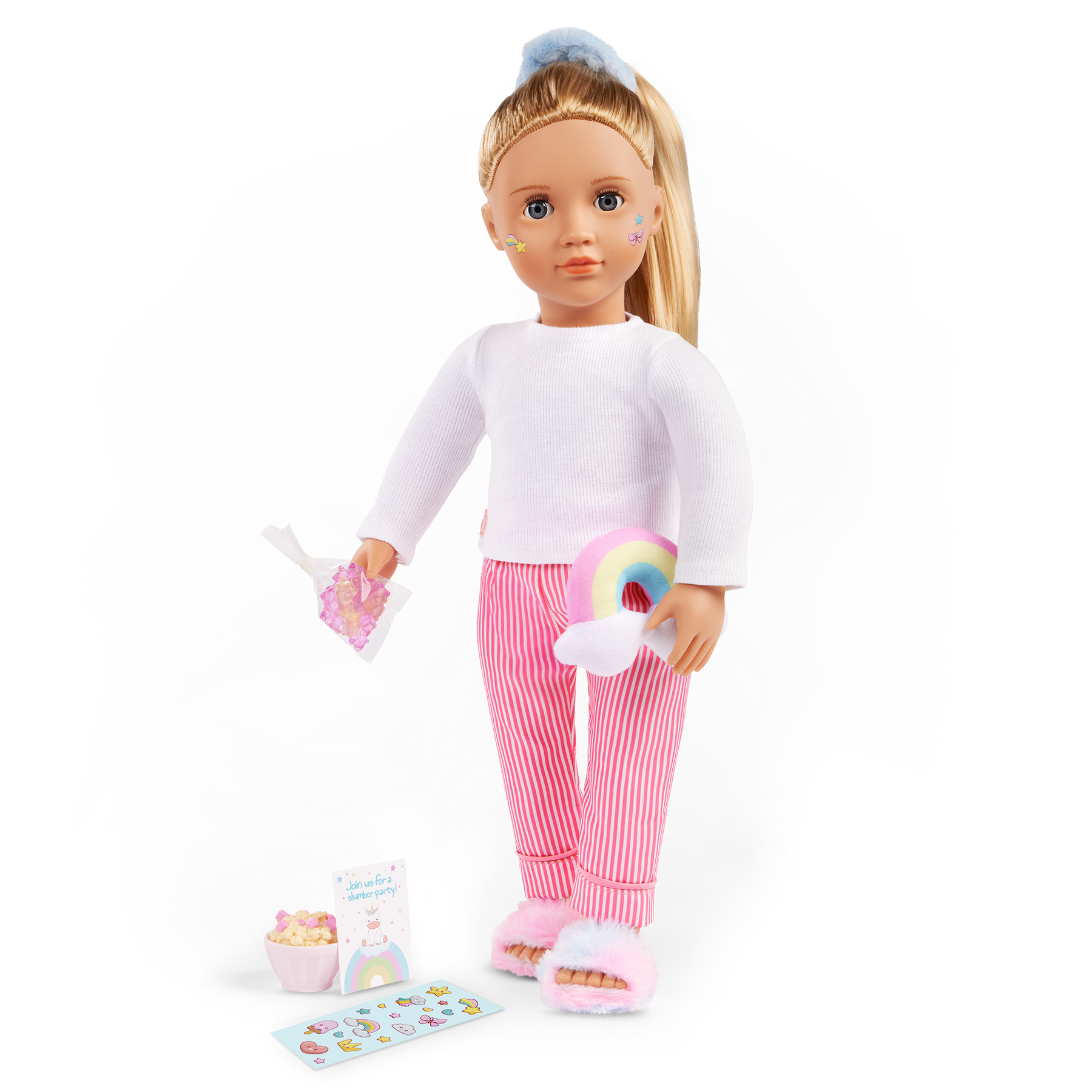 Get the pyjama party started with the Our Generation Slumber Magic outfit! This 46cm doll clothing set is packed with sweet essentials for kids to role-play as the party host or dream up fun bedtime stories. The long-sleeved top with cute candy-striped bottoms, a hair scrunchie, and colourful tie-dye slippers create the perfect combination. Plus, kids can apply the face stickers to their doll to create lots of magical looks! Themed accessories like a rainbow pillow, bowl of popcorn, and candy bag expand the play as kids invite other doll besties to the party. The pyjama outfit has easy-open closures to quickly put on and remove as kids mix and match to create even more dazzling trends. Our Generation doll clothes make a great gift for kids ages 3+ (small parts), encouraging them to create their own unique stories. Compatible with most 46cm dolls, doll clothes, and doll accessories. Our Generation dolls sold separately.
