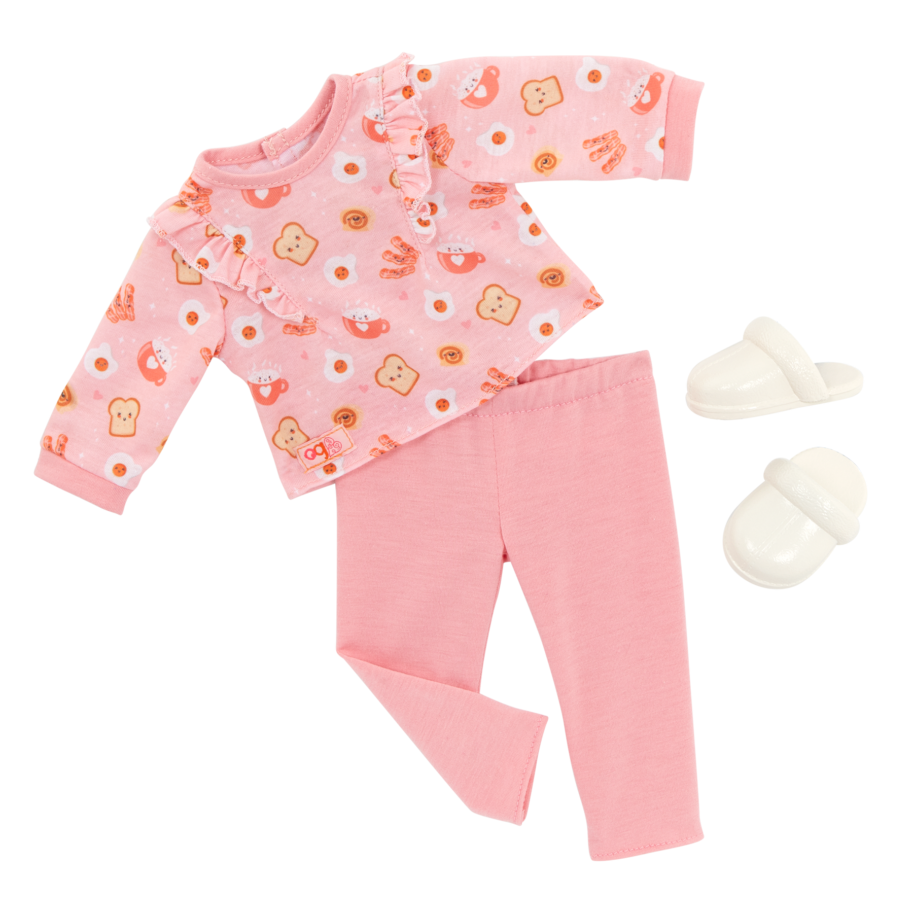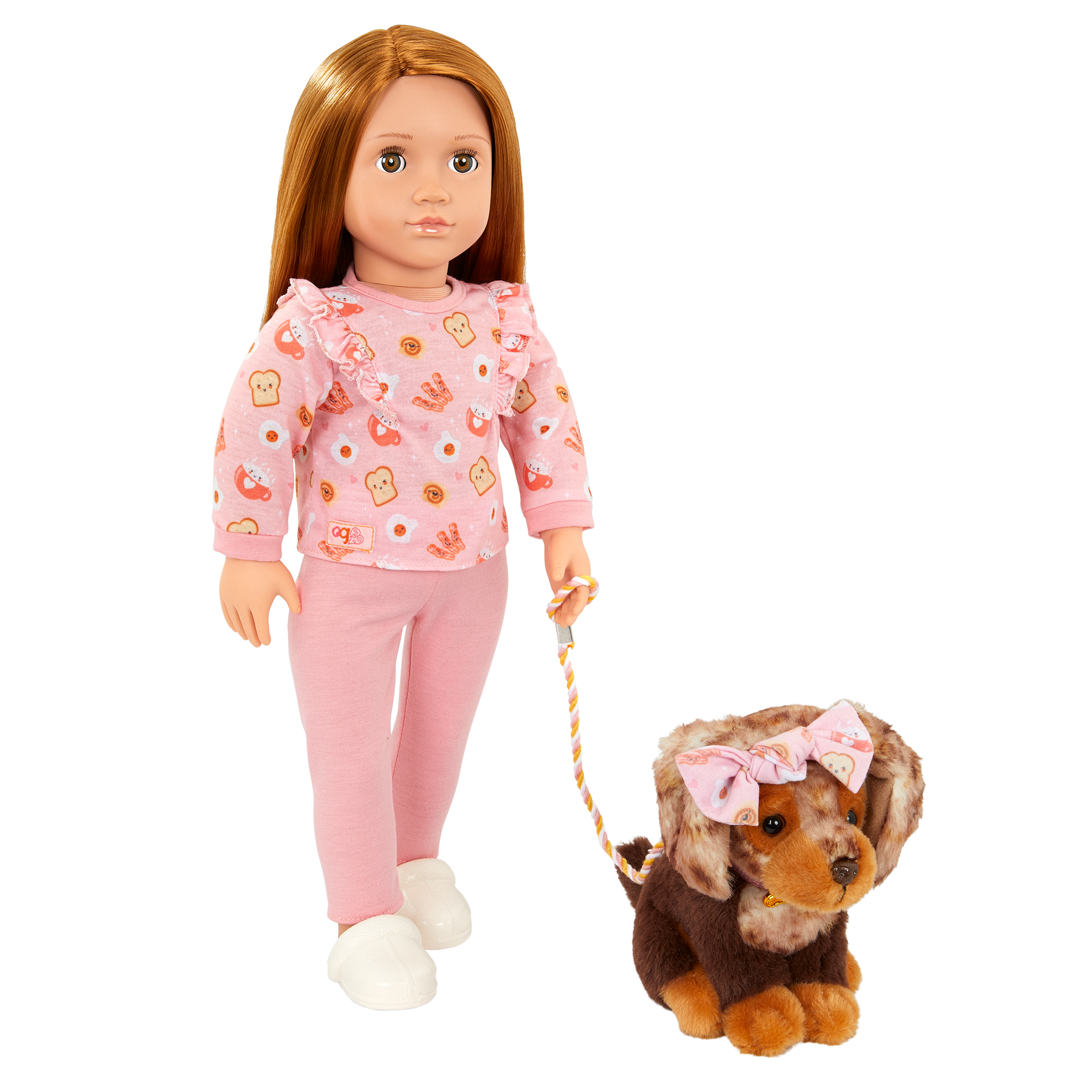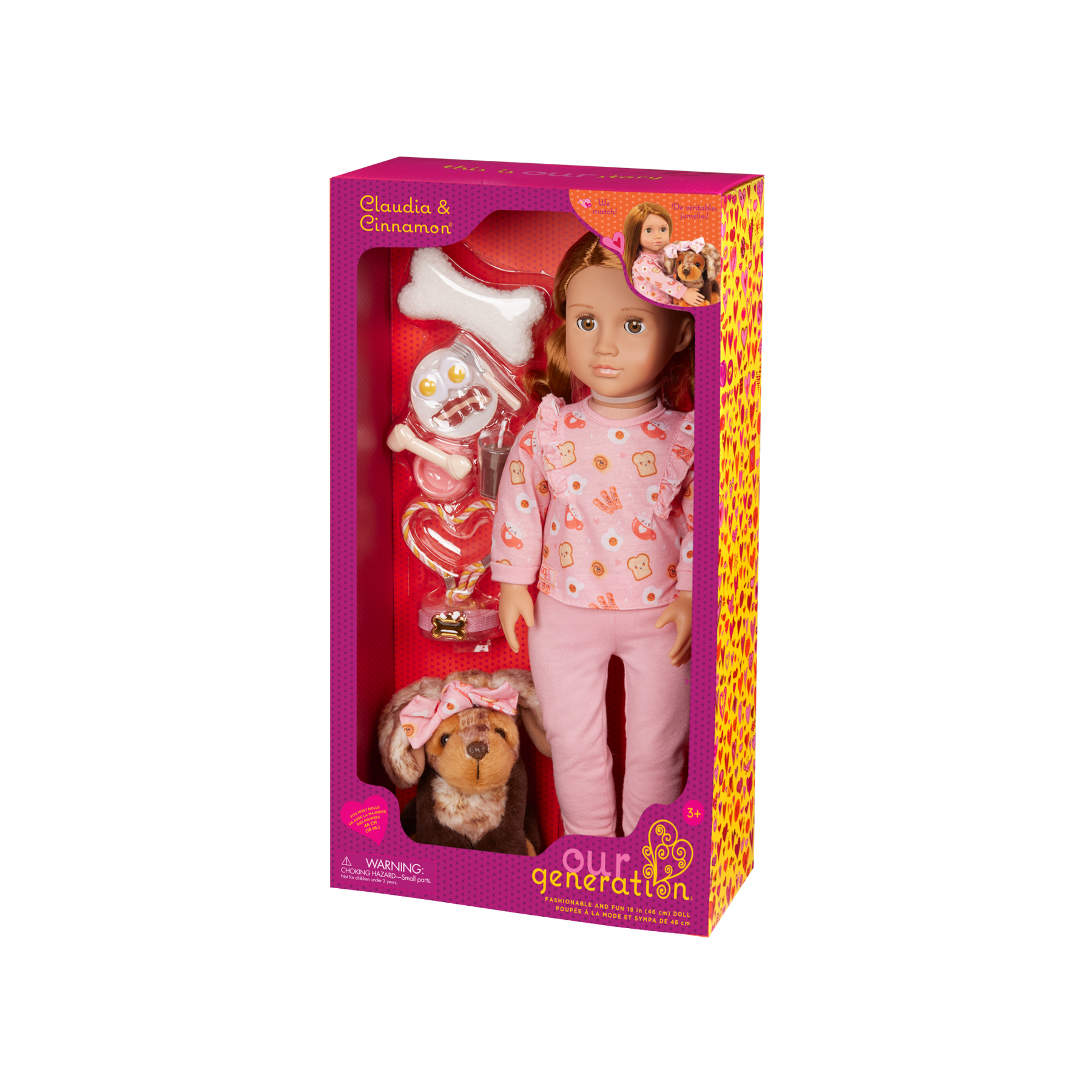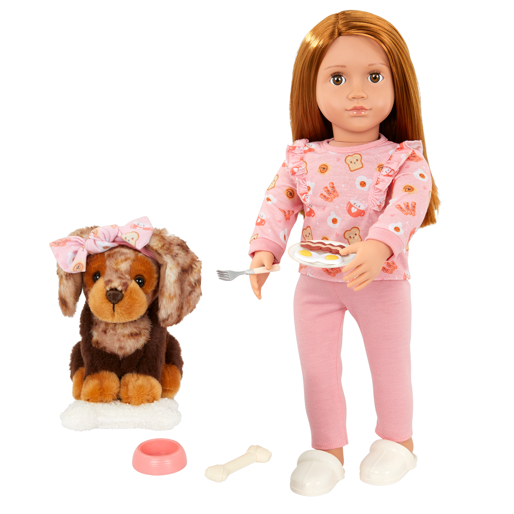 From breakfast to bedtime, Our Generation 18-inch doll Claudia and her pup Cinnamon love matching in fun fashion! Claudia has a huggable soft body and lifelike features, from her beautiful hazel eyes that open and close to her long red hair to style. Keep Cinnamon comfy with the pillow as you prep a delicious breakfast. This set includes play food accessories like eggs, a slice of bacon, a plate, chocolate milk, a fork, a toy bone, and a food bowl. And the leash attaches to Cinnamon's collar when it's time to go out and about! Claudia's playful pup is a 6-inch Dachshund breed. It has soft plush fur and a stylish hair bow that matches Claudia's outfit! Claudia arrives wearing a cute pyjama outfit with a food-print top and slippers. Her outfit also has easy-open closures to quickly put on and remove, so you can mix, match, and create more fun looks every day!