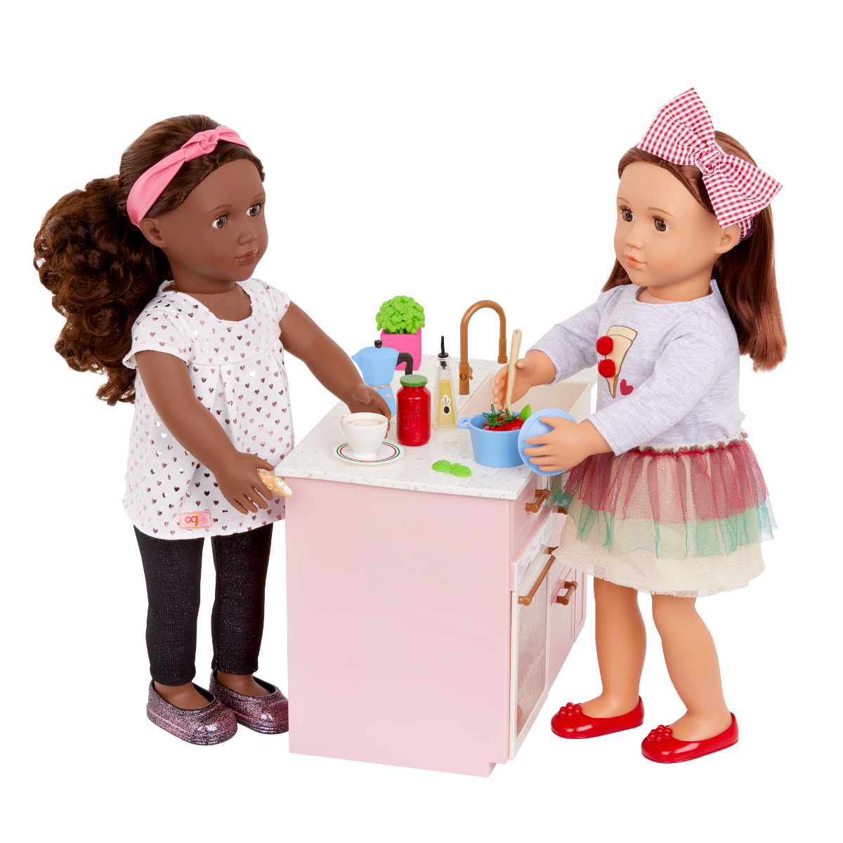 Playtime pasta-bilities are endless with the 24-pc Our Generation Pasta Party set! Before the meal is ready, there's a whole lot of cooking fun to explore. Little chefs will learn how to make homemade pasta with a rolling machine that really turns! Just insert the pasta sheet and crank the handle - PERFECTO! Detailed play food accessories in bright colours create engaging meal prep. Plus, kids will love mixing and matching these pieces with other pretend food sets to spice up their playtime menus. It comes complete with pasta-making ingredients as well as cute kitchen items like a salt mill, cheese grater, and traditional espresso maker. Compatible with most 46cm dolls and accessories. Our Generation accessories make a great gift for kids ages 3+ (small parts), encouraging them to create their own unique stories. Dolls sold separately.