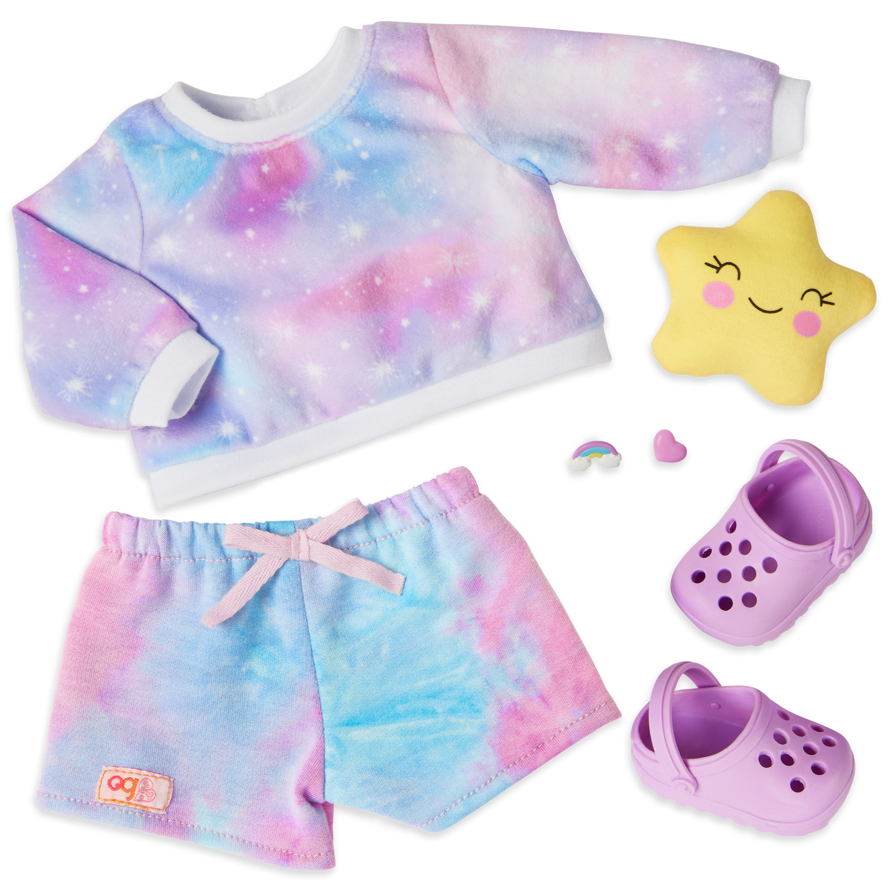 Dream big and create endless sleepover fun with Our Generation 46cm doll Carmen! What makes the ultimate slumber party? Best friends, lots of laughter, and fantabulous PJs, of course! Her cosmic tie-dye pyjamas are beaming with vibrant pink, blue, and purple hues. Plus, themed accessories like shoe charms add extra styling flair, while a star plush pillow makes every sleepover wish come true. This 46cm doll has a huggable soft body and lifelike details to delight doll fans during playtime. Her wavy auburn hair is fun to brush and style, and her dark-brown eyes really close as kids explore sweet dreams together. An easy-change outfit inspires mixing and matching as fashion lovers dream up even more fun looks on any adventure. Our Generation dolls make a great gift for kids ages 3+ (small parts), encouraging them to imagine their own unique stories.