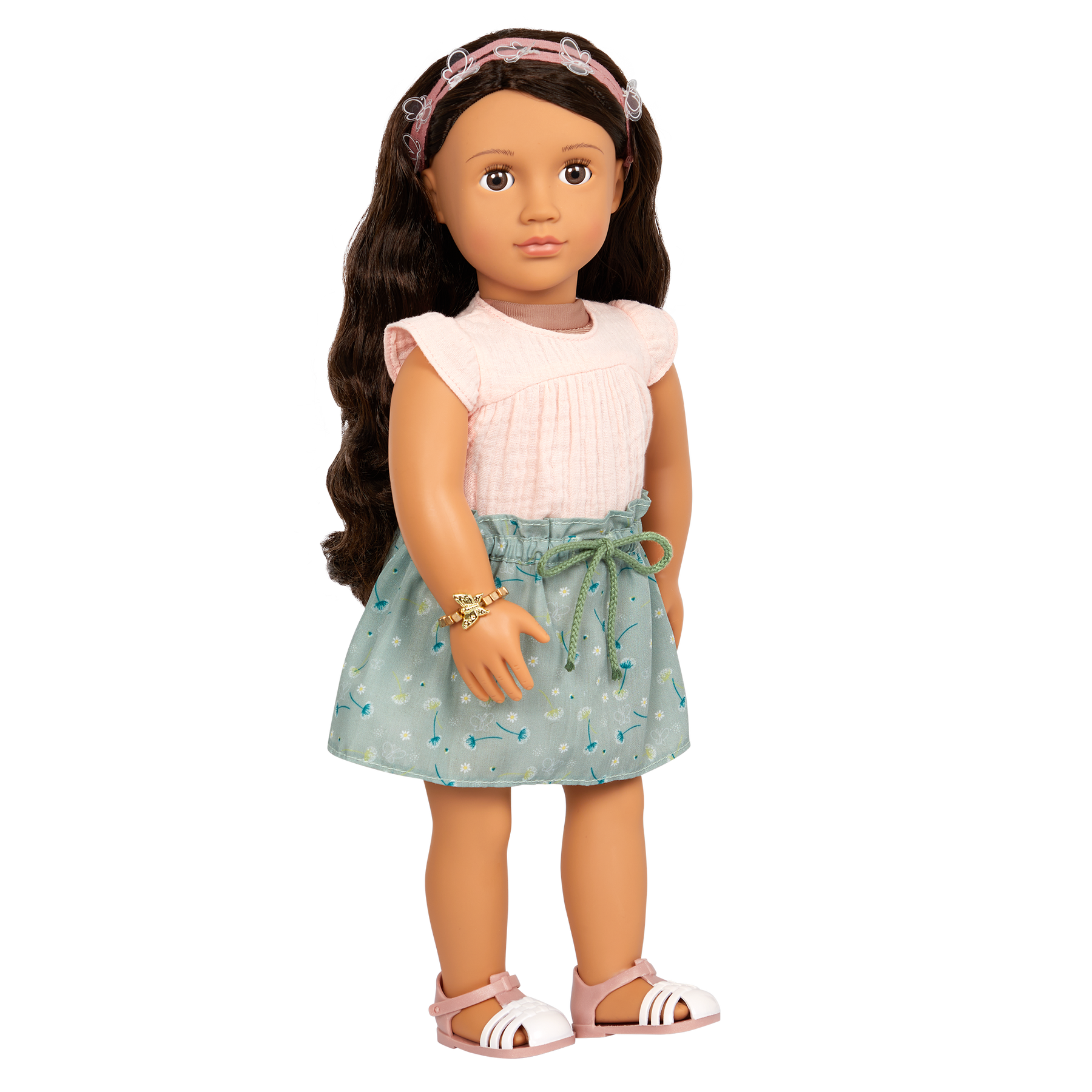 Explore cute and stylish butterfly fashion with the Our Generation All Aflutter outfit! A fresh and trendy ensemble that features a casual, cap-sleeve top and a pretty dandelion skirt, your doll bestie will be feeling cosy on every bright adventure. Complete the outfit with the pair of jelly sandals as you skip out for a day of fun. Then accessorize the look with the included charm bracelet and headband - it has mini decorative butterflies that add a touch of playful style to your doll's creative 'dos! (Dolls sold separately)