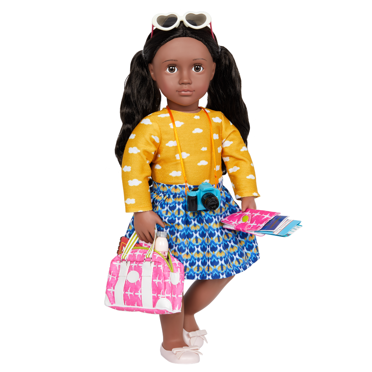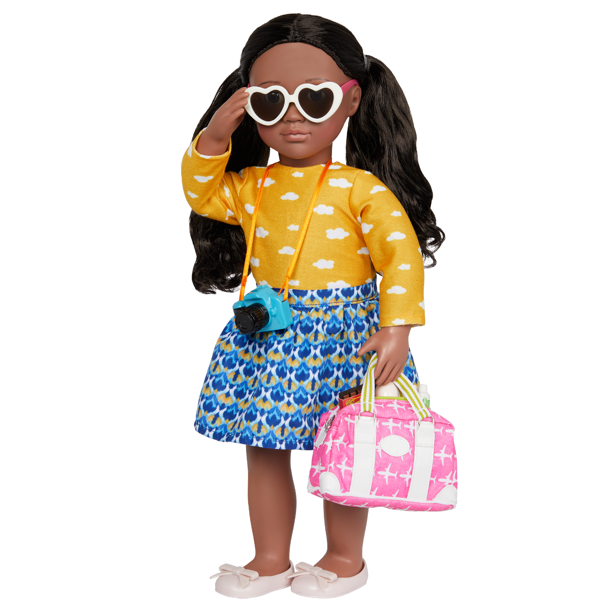 The Bon Voyage Travel Set by Our Generation is your passport to fun and adventure! Let your 46cm dolls be the perfect tourist with an adorable carry-on bag covered in mini airplanes. Your doll is ready to board with the boarding pass and passport. Keep your doll entertained and well-fed with the deck of cards, chocolate, and crackers! Toiletries, a camera, and super cute heart-shaped sunglasses are perfect to keep your doll looking stunning. The sunglasses even come with a case that match the carry-on bag. Talk about coordinated! Take flight and have a blast on your next doll trip with this awesome travel set from Our Generation.