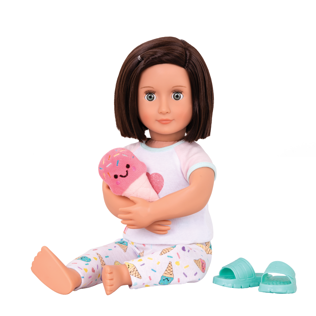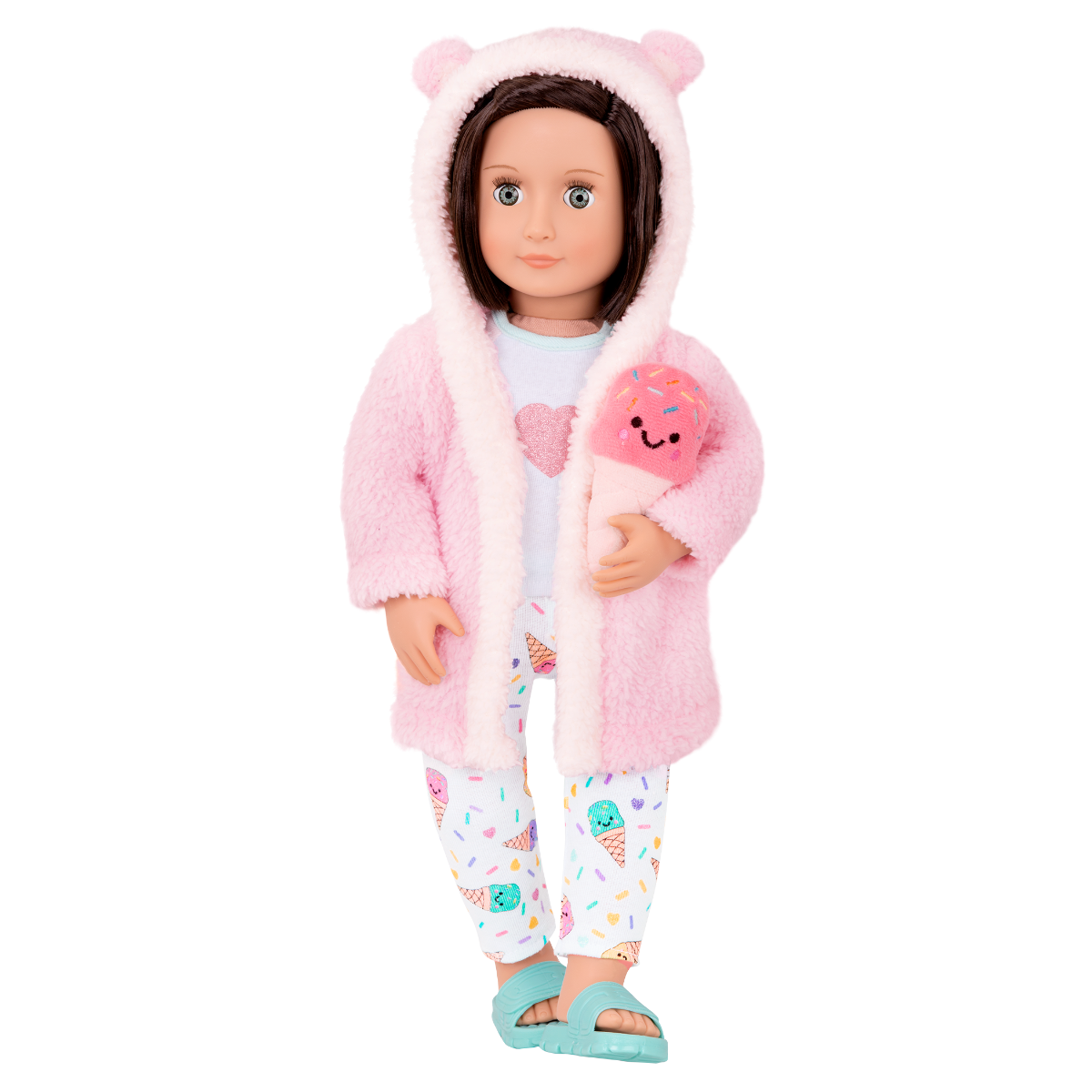 I dream, you dream, we all dream of ice cream! Keep your 46cm Our Generation doll cosy in the Ice Cream Dreams outfit! These bedtime pyjamas feature a soft, fluffy, pink hooded robe and blue sandal-style slippers for your dolls to grab a nighttime snack – they can even snuggle with the ice cream cone plush! Easily dress your besties in the cute top with the decorative heart, and the pyjama bottoms with mini ice cream prints will give them extra sweet style during their super fun slumber parties! (Dolls sold separately)